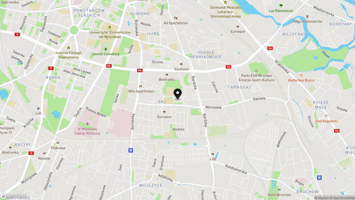 LOKALIZACJA: Wrocław - Krzyki, Gaj, ul. Orzechowa. Spokojna dobrze skomunikowana okolica zaledwie 2 min spacerem do przystanków komunikacji miejskiej. Blisko PKP, PKS oraz Park Skowroni i Wzgórze Gajowe. Wokół doskonała infrastruktura do biegania oraz wycieczek pieszych i rowerowych. W bezpośrednim sąsiedztwie szkoła, szpital, centrum handlowe Ferio Gaj oraz Kluby Fitness.