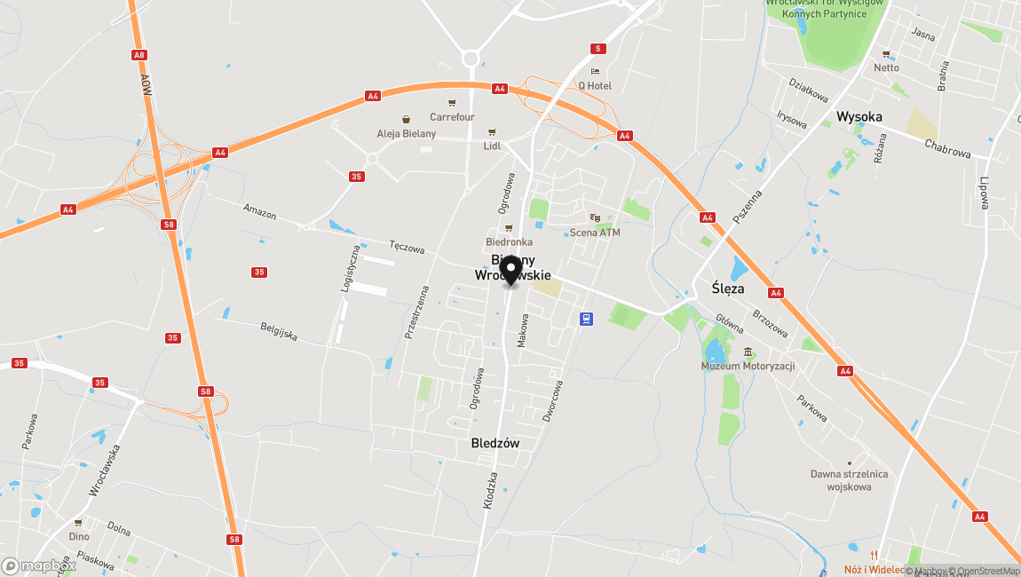 Lokal położony jest zaledwie 1 km od granicy Wrocławia, tuż przy węźle komunikacyjnym łączącym: