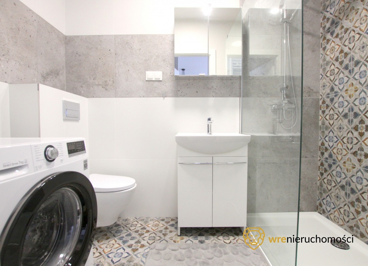 - łazienka z prysznicem i pralką