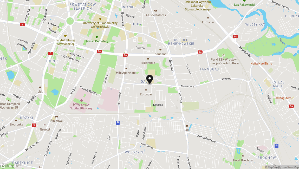 Inwestycja znajduje się przy ul. Świeradowskiej, w bardzo zacisznej i spokojnej dzielnicy Gaj. Idealna dla osób poszukujących spokojnego miejsca do życia. W pobliżu galeria handlowa Ferio Gaj, przystanki autobusowe i tramwajowe, sklepy osiedlowe, przychodnia, park, punkty usługowe.